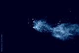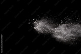Freeze motion of white dust explosion on black background. Stopping the movement of white powder on dark background. Explosive powder white on black background.