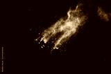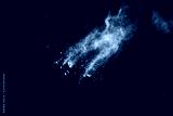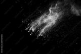 Freeze motion of white dust explosion on black background. Stopping the movement of white powder on dark background. Explosive powder white on black background.
