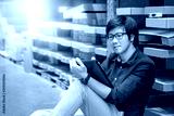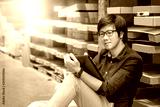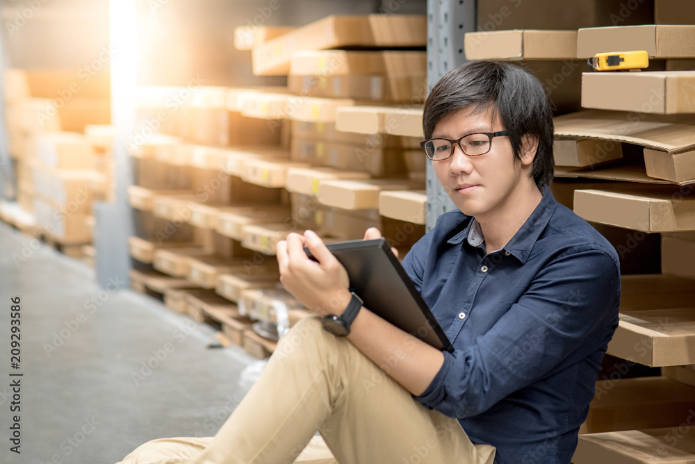 Young Asian man doing stocktaking of product in cardboard box on shelves in warehouse by using digital tablet. physical inventory count concept