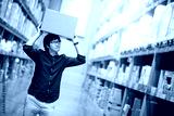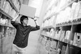 Young Asian man carrying cardboard box over head between row of shelves in warehouse, shopping warehousing or working pick and packing concepts