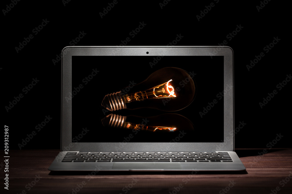 One silver modern laptop with a glowing light bulb on wooden table in a dark room on black background. Nice mockup for your IT project. Idea or solution concept.