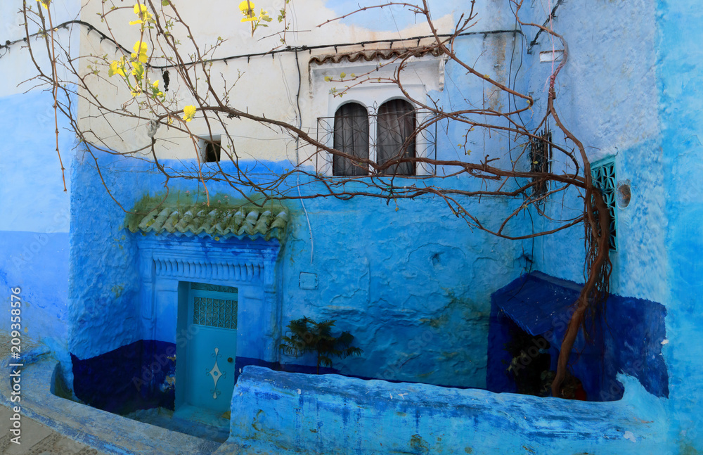 Traditional housing with the typical blue facade in Chaouen, Morocco