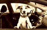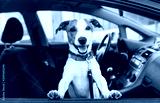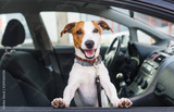 Cute dog sit in the car on the front seat