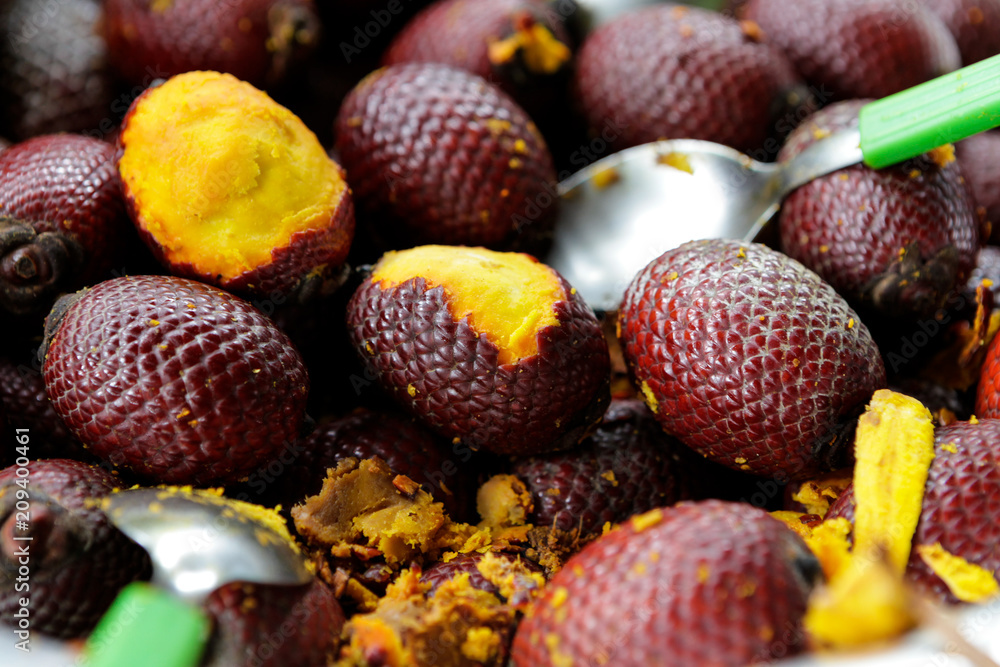 Close up of fresh "buriti" fruit inside metal bown in Amazon rainforest.