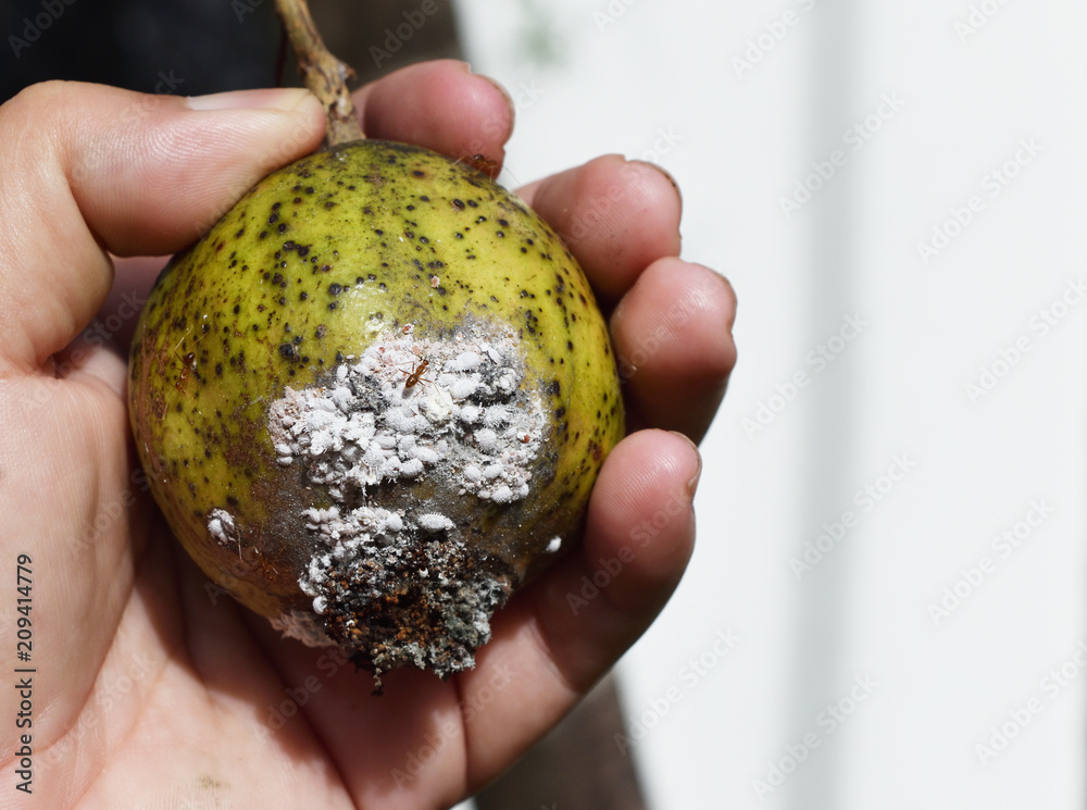 Orange color ants and Cotton Mealy bugs on green Pomegranate fruit in the human hand, Homoptera: Pseudococcidae ,