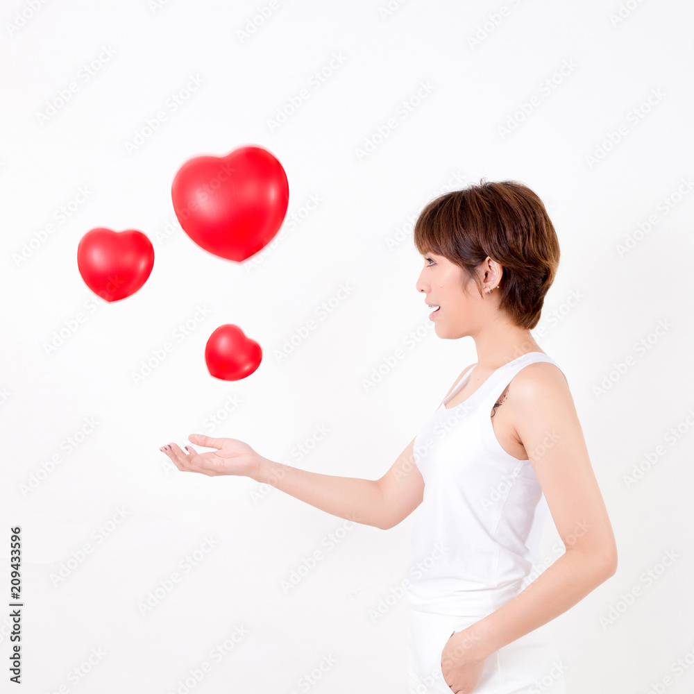 Bautiful young asia woman throwing the red heart on her head. Isolated on white background. Studio lighting.