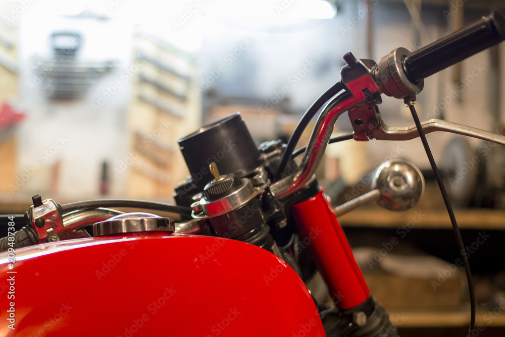 Part of red vintage motorcycle parked in the garage, close-up