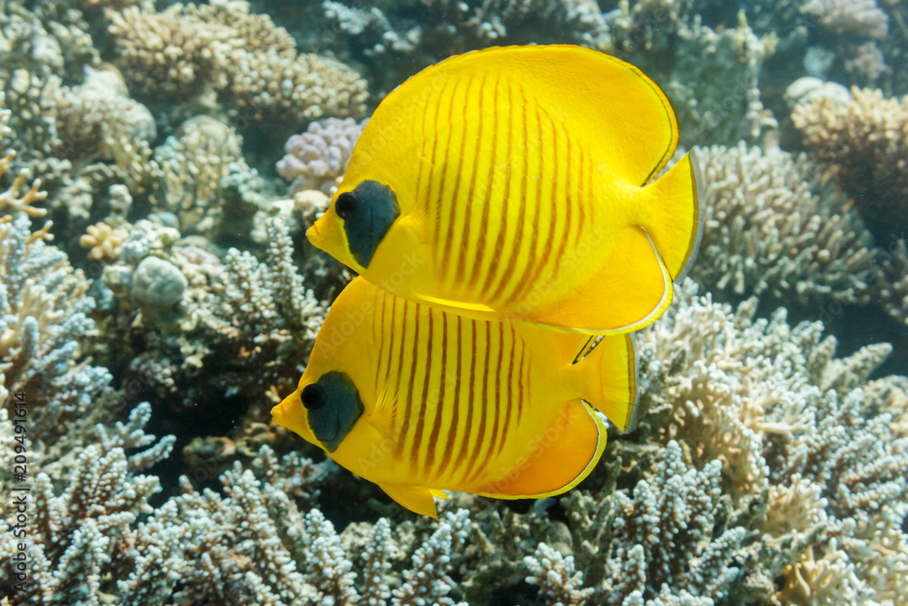 Pair of Masked butterflyfish on a coral reef of the red sea.