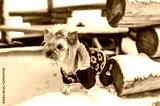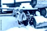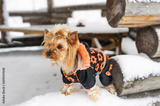 Yorkshire terrier stand on log. Portrait small dog in winter hut.