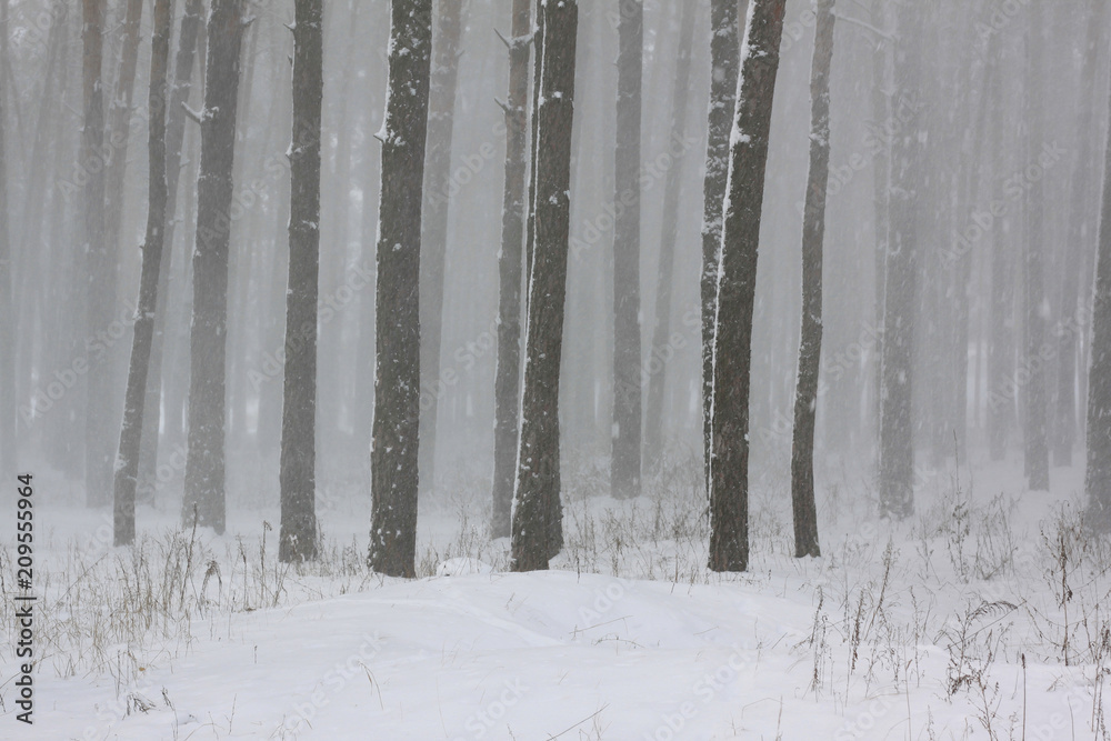 Winter trees in winter snow-covered forest on white snow in blizzard and frost