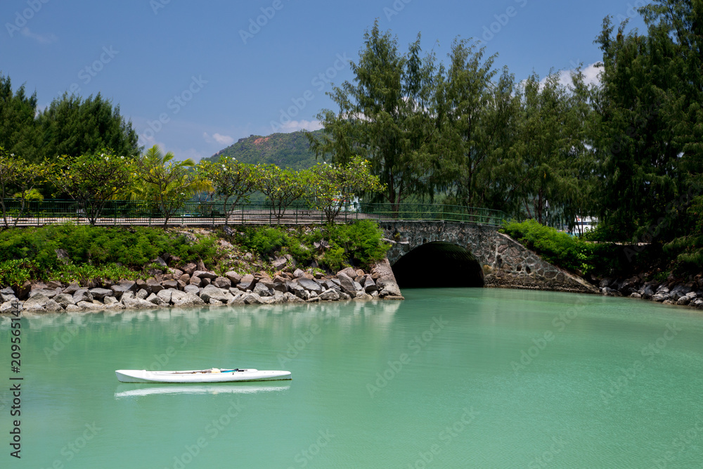 The beach of the Seychelles with blue water and stones