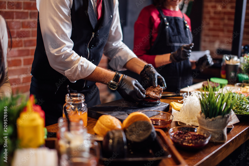Chef making beef burgers indoor at restaurant kitchen, participating in food festival event.