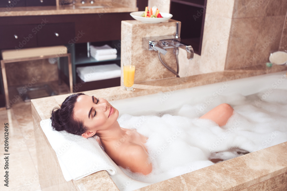 Carefree girl lying in bathroom in soapy water with bubbles. She threw her head back on towel and closed eyes in content. Glass of orange fresh and fruit plate are on background
