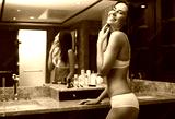 Smiling girl dressed in underwear standing by mirror in bathroom. She is delicately touching edge of her face while looking at camera with joy. Her reflection is on background