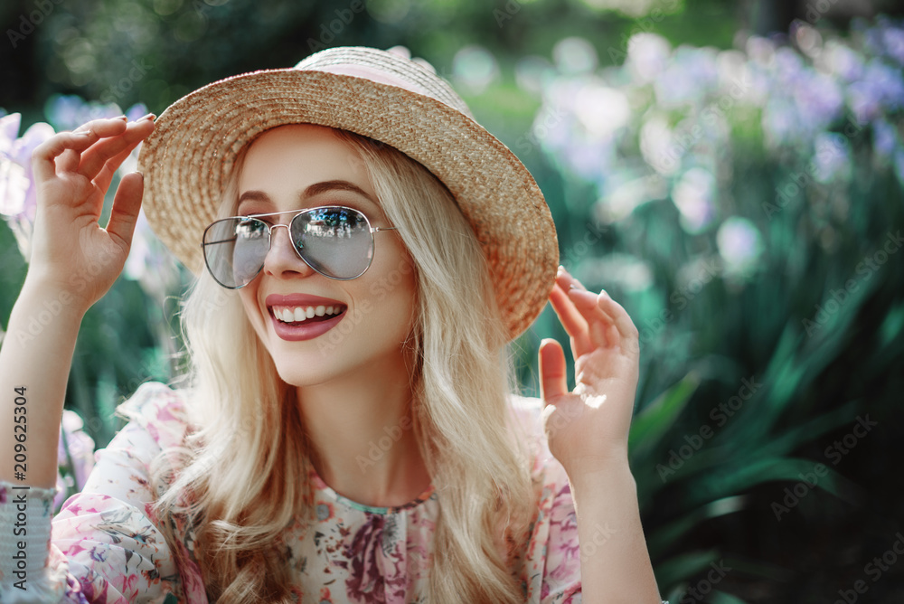 Outdoor close up portrait of beautiful young happy smiling woman wearing blue sunglasses, straw hat posing in the blooming garden. Model looking aside. Copy, empty space for text