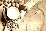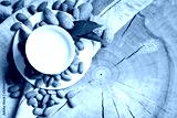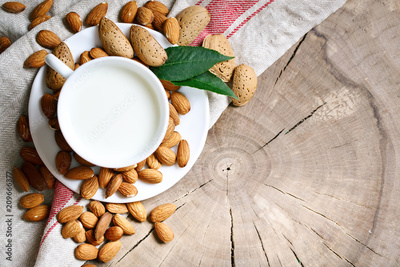 Almond and almond milk on a wooden table in the summer garden. Useful food.