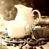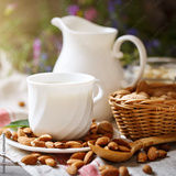 Almond and almond milk on a wooden table in the summer garden. Useful food.