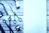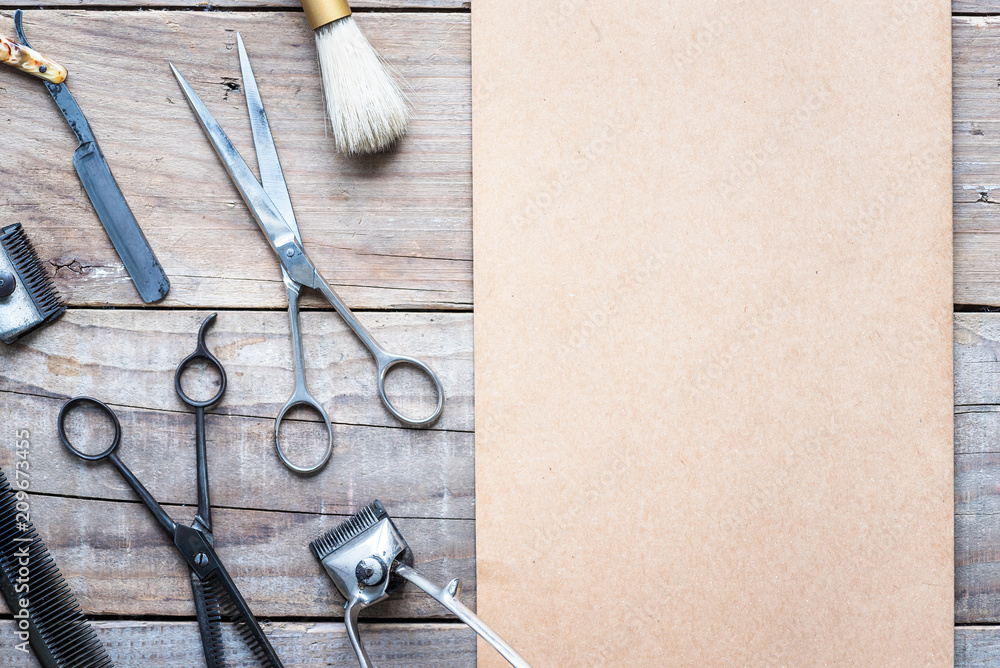 Old vintage barbershop tools on wooden table - barbershop background with copy-space