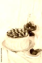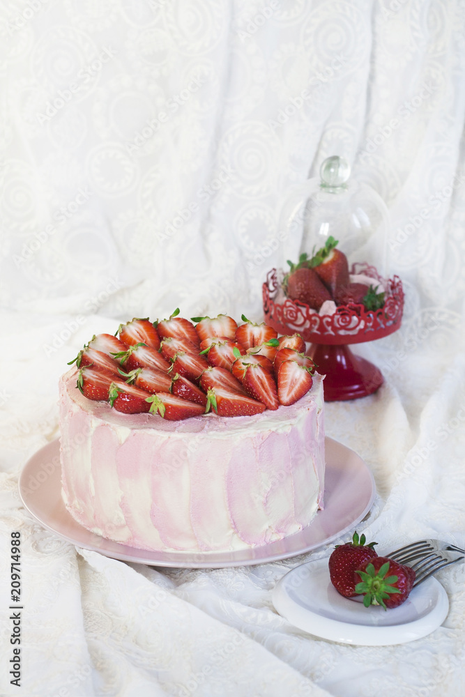 Homemade cake with strawberries and cream-cheese and white chocolate ganache cream.