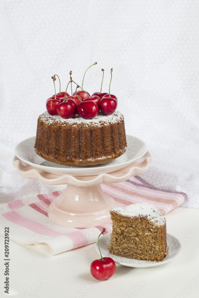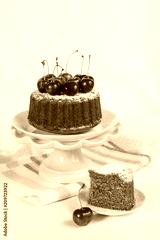 Homemade cake made from tea earl grey, with sugar icing. Decorated with cherries.