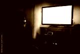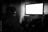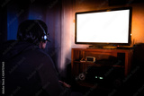 Young male gamer with glasses and headset playing video game at home in the dark room using game console controller watching at LED TV. Gaming and entertainment concepts