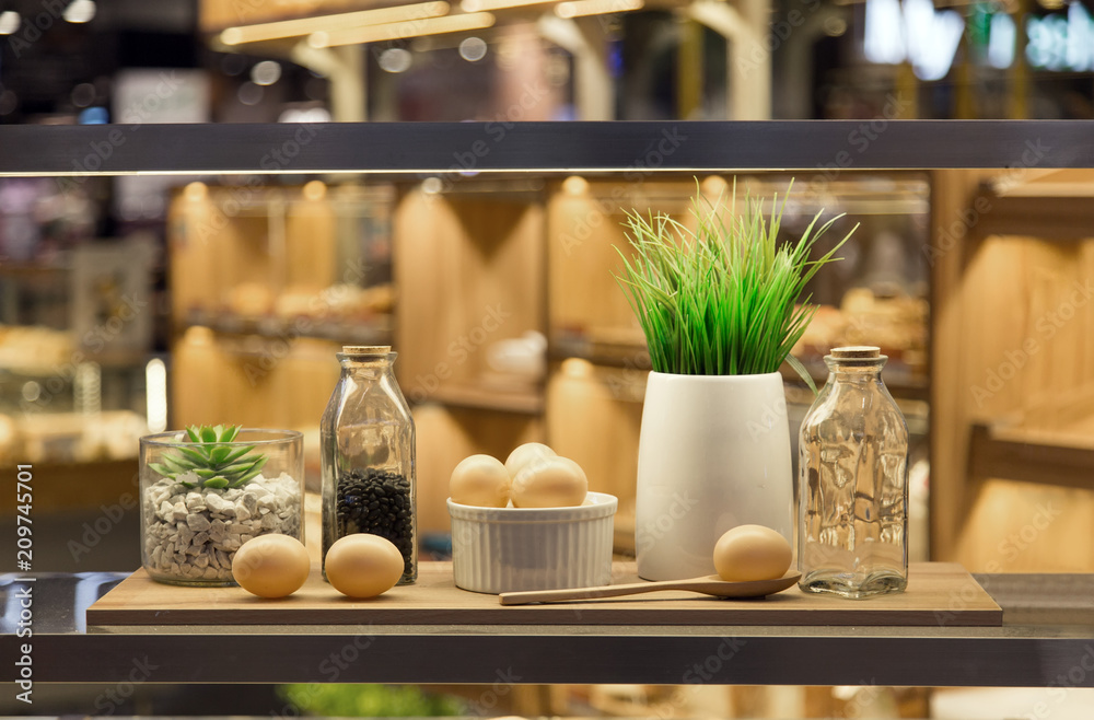 Decoration kitchen shelf showcase with egg bean stone and vase of grass