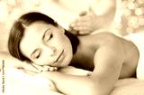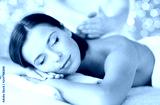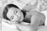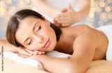wellness, spa and beauty concept - close up of beautiful woman having massage over holidays lights background