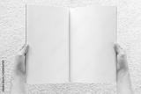 Blank open book page mock up with hand holding catalog ,magazines, brochure or note mockup template with paper texture copyspace