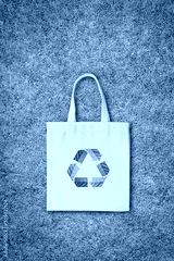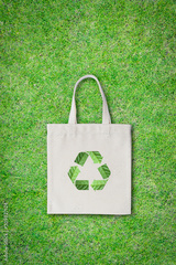 Eco canvas tote bag, shopping bag concept with fabric sack cloth totebag with recycle sign isolated on green lawn (clipping path)