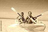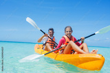 Happy girl and her father kayaking at tropical sea on yellow kayak