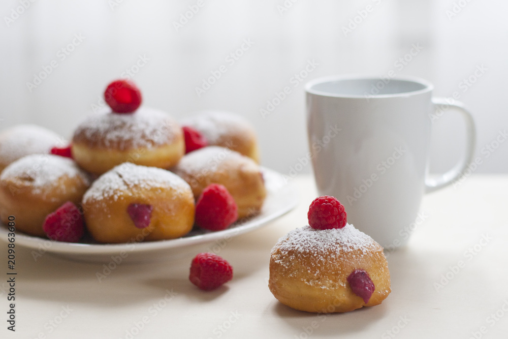 Breakfast with Krapfen (or berliner, or doughnut, or bombolone) made from yeast dough fried, with berry curd filling, powdered conventional sugar on top.