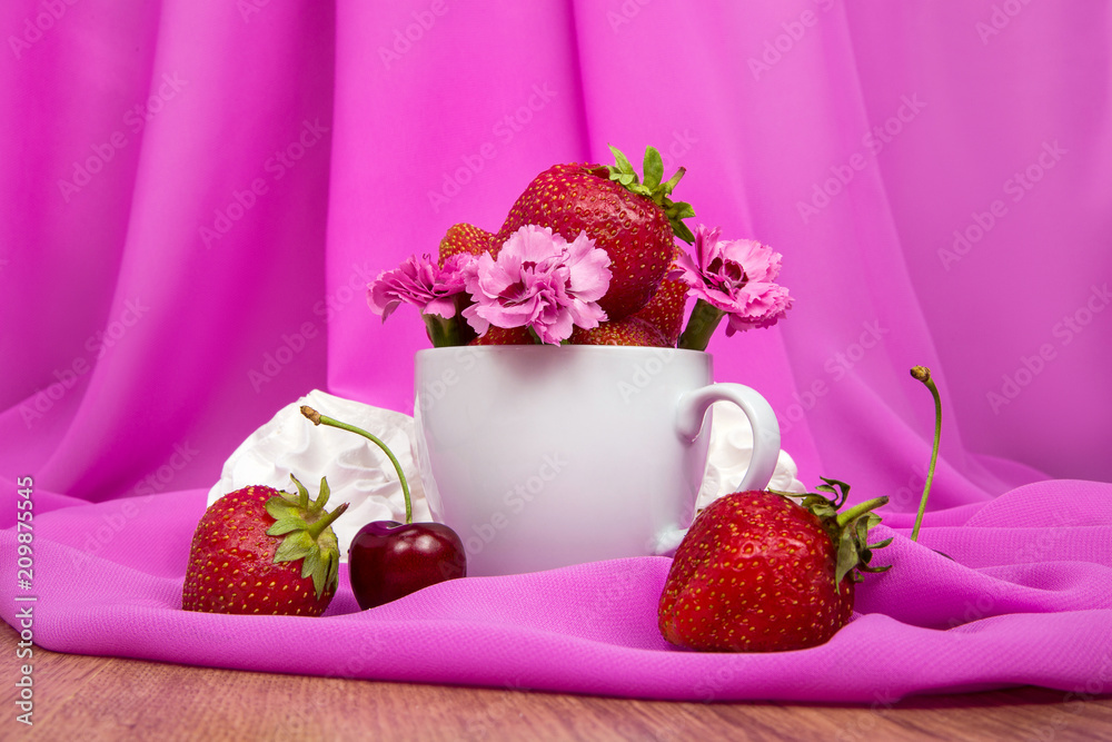 cup with strawberries, flowers, cherries on a pink background