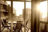 Summer Terrace With Garden Furniture In The Background Of The City And Sunset. Luxury Apartments Resort Recreation Summer Concept