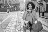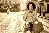 Outdoor portrait of young beautiful happy smiling woman posing in street of european city. Model wearing summer striped dress, hat, holding camera, straw bag with peonies. Copy, empty space for text