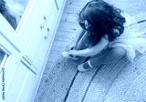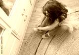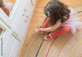 High angle view of little girl wearing pink tutu and orange tights putting on ballet shoes in bedroom (selective focus)