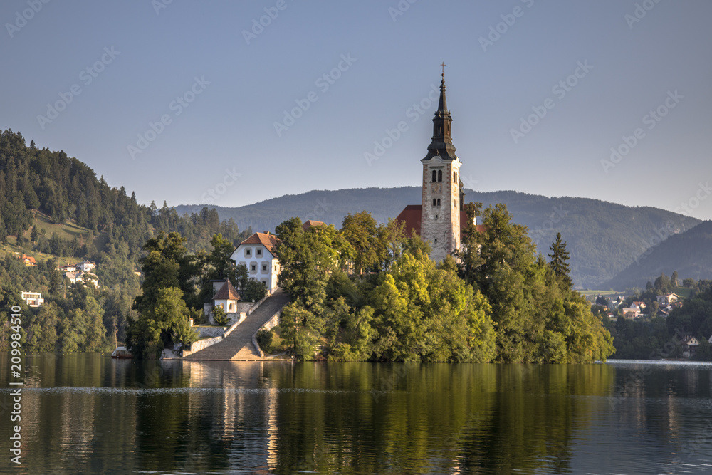 Island in lake Bled in foggy morning light
