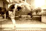 Young Asian attractive woman doing yoga exercise near swimming pool. Pilates workout and healthy lifestyle concepts. International yoga day