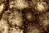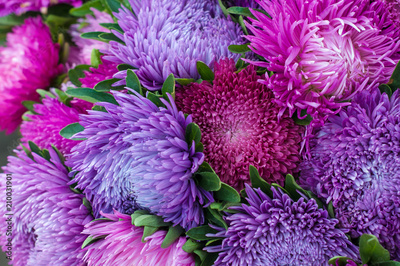 Frilly purple asters in the summer garden. A bouquet of blooming Callistephus chinensis. Lush fresh magenta flowers asters growing in the flower bed.