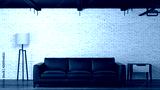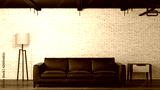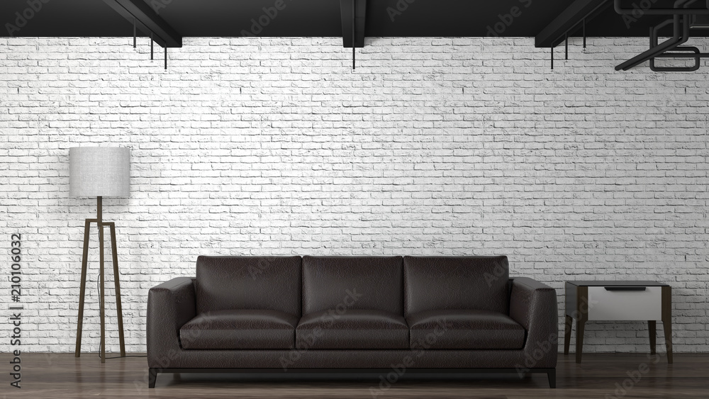 Brown leather sofa in front of a white brick wall 3d illustration furniture set,Floor lamp,Cabinet,wooden floor home
