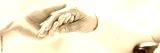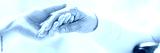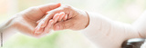 Close-up of tender gesture between two generations. Young woman holding hands with a senior lady. Blurred background. Panorama.