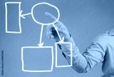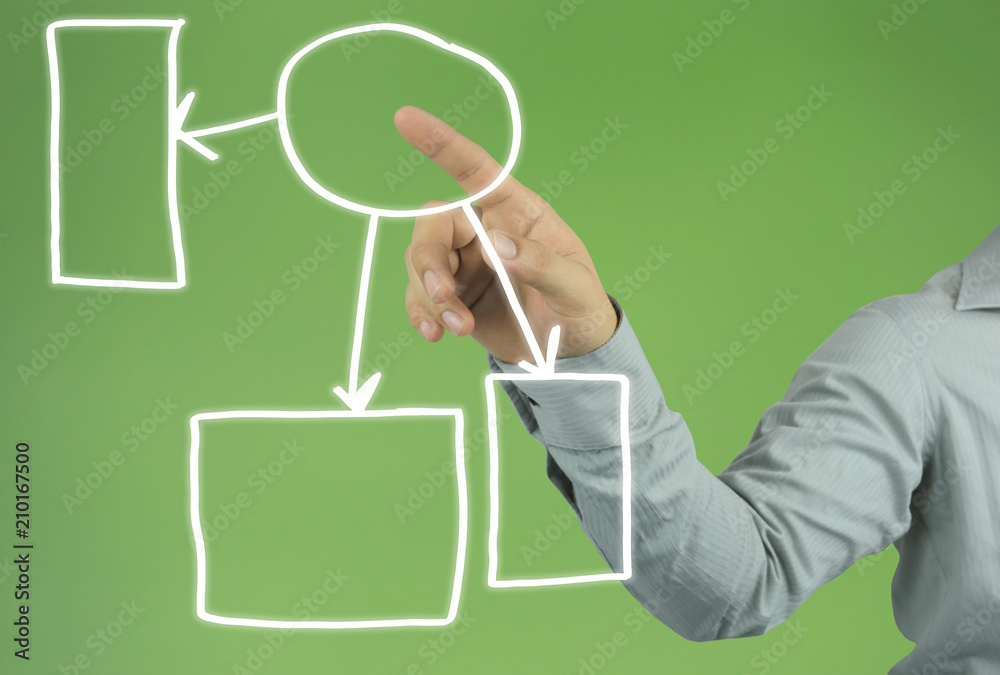 Hand of businessman point to a Geometric shapes symbol on green background.