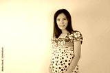 Asian pregnant women in fashion shoot portrait of wearing brown dress in the bedroom.
