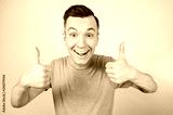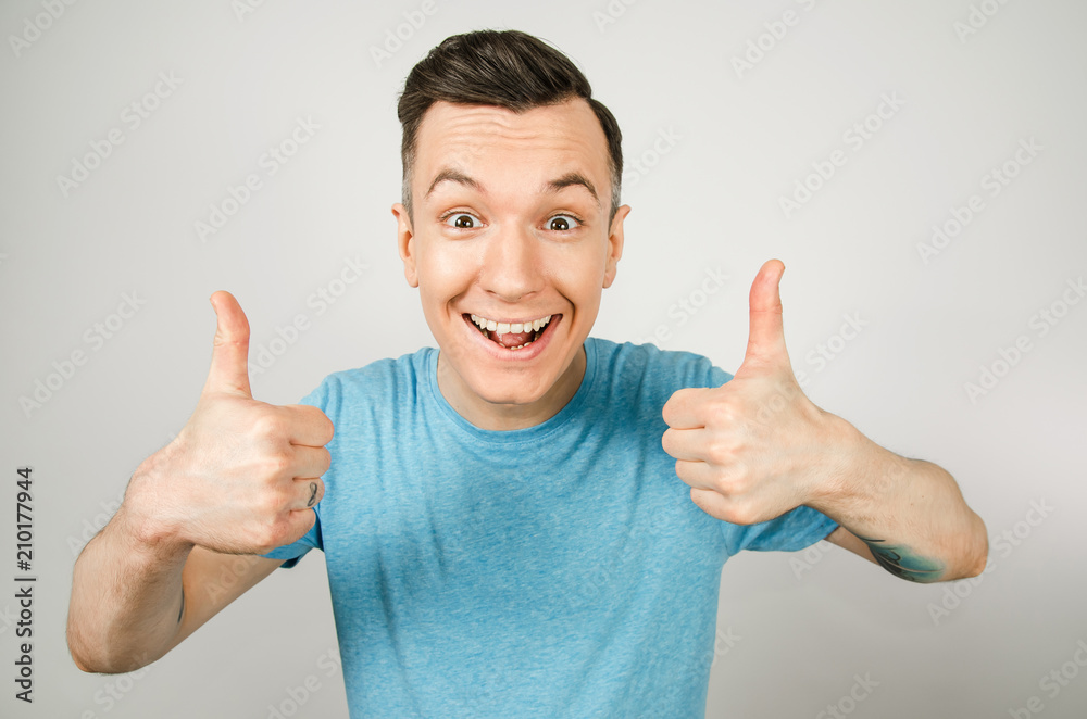 Young guy shows thumbs up dressed in a blue t-shirt on a light background.