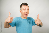 Young smiling guy dressed in a blue t-shirt shows thumbs up on a light background.