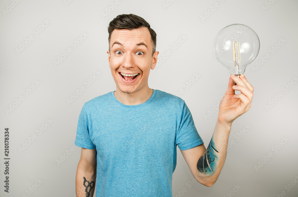 Young smiling guy dressed in a blue t-shirt holding lamp on a light background.