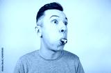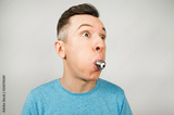 Young guy with bulb in a mouth dressed in a blue t-shirt holds bulb in a mouth on a light background.