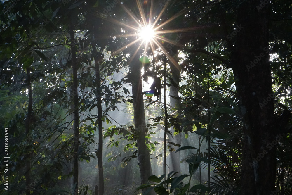 Ray of light trough the trees in the forest, Indonesia