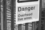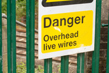 Warning sign of live wires on the railway track
