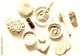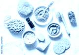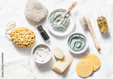Spa accessories - nut scrub, sponge, facial brush, natural soap, clay face mask, pumice stone, essential oil on a light background, top view. Healthy lifestyle concept. Beauty, skin care. flat lay