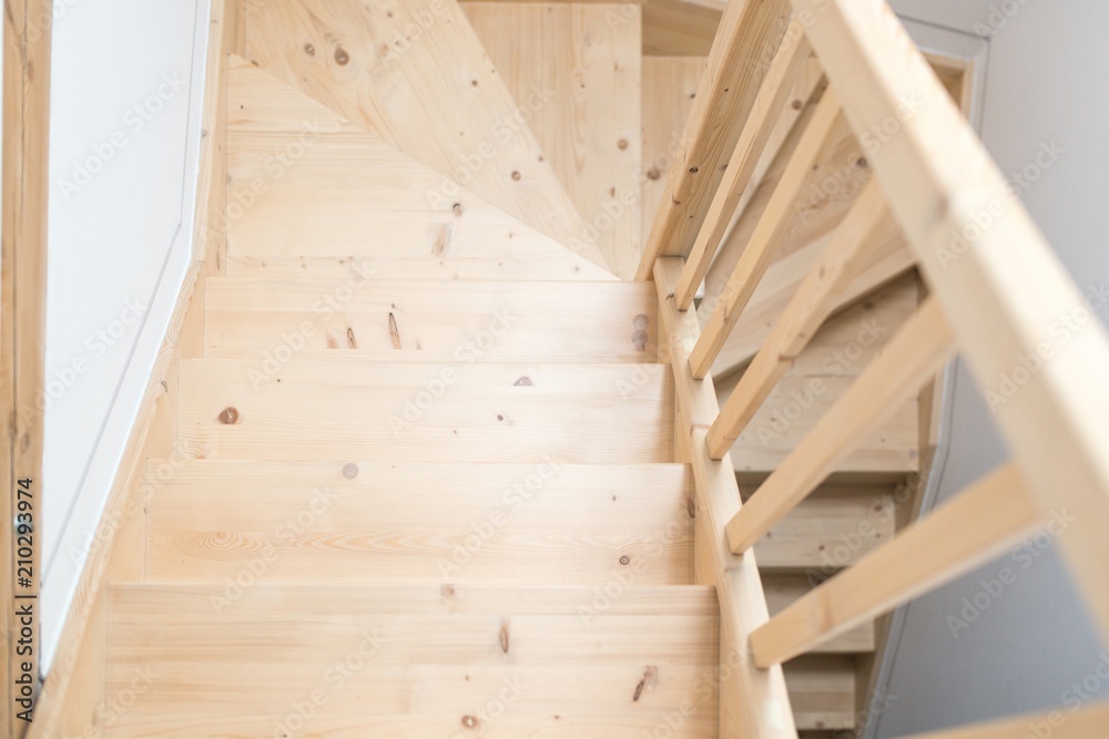 Wooden pine stairs in hall.